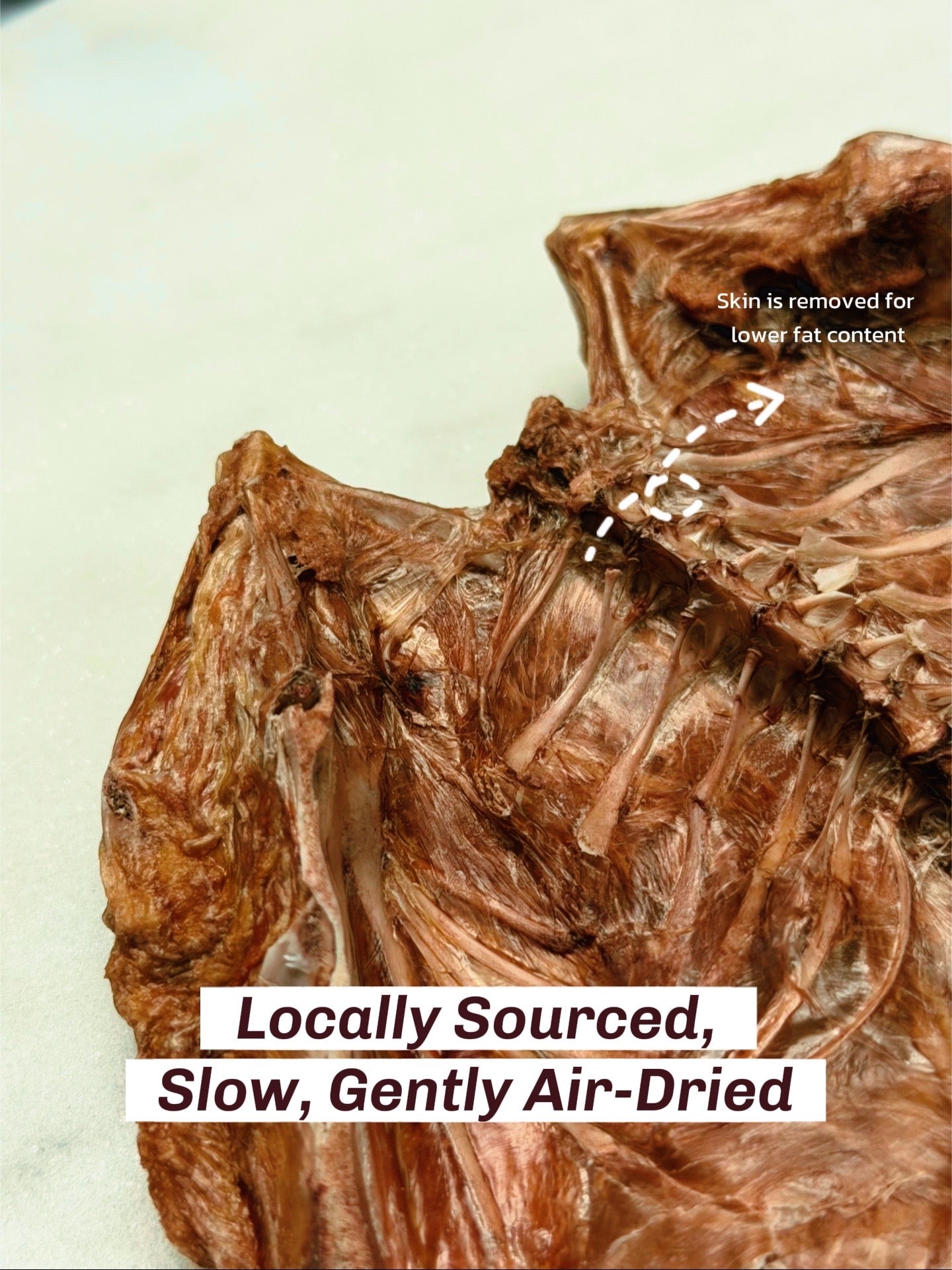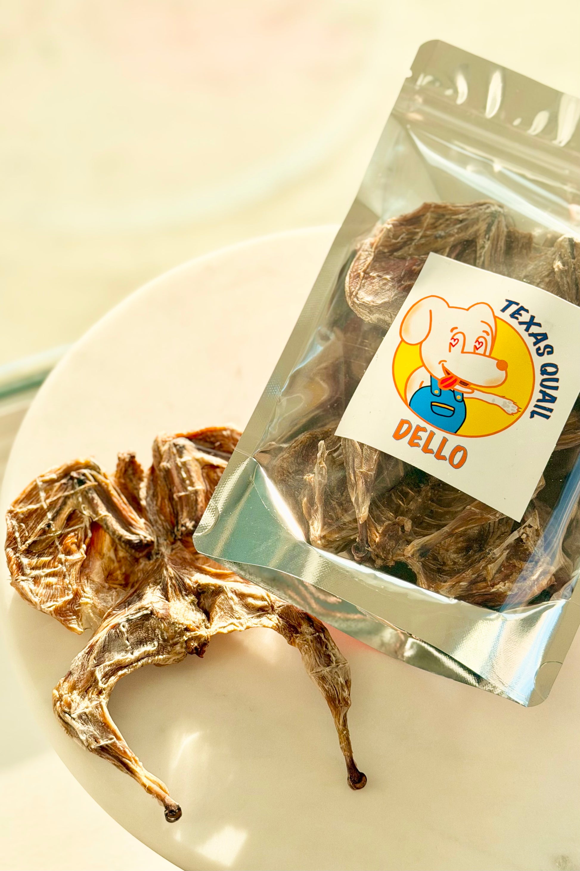 Texas whole quail chews are made with locally raised quail, providing a clean, high-quality source of lean protein. Light, flavorful, and naturally nourishing, they make a perfect everyday reward. Crafted at home with care and freshness you can trust. Each pack has 2ct of whole Texas quail